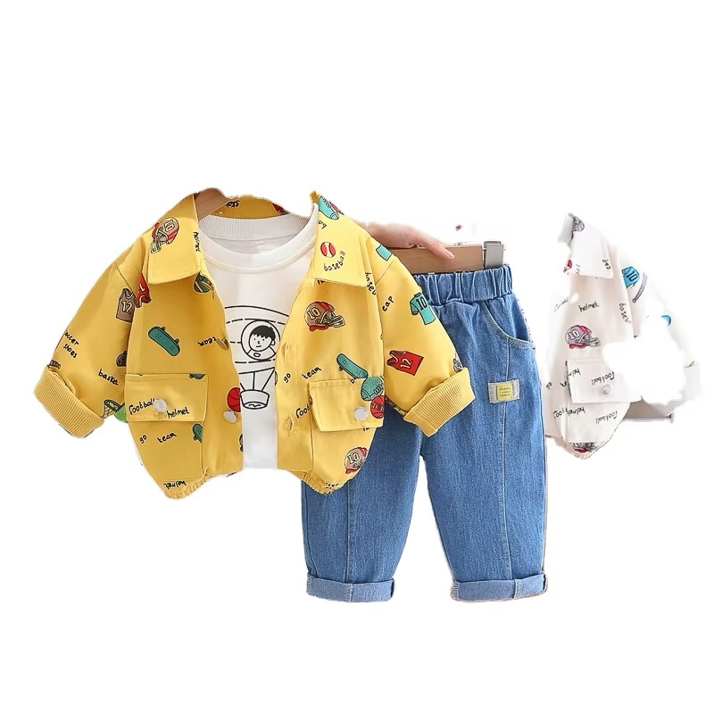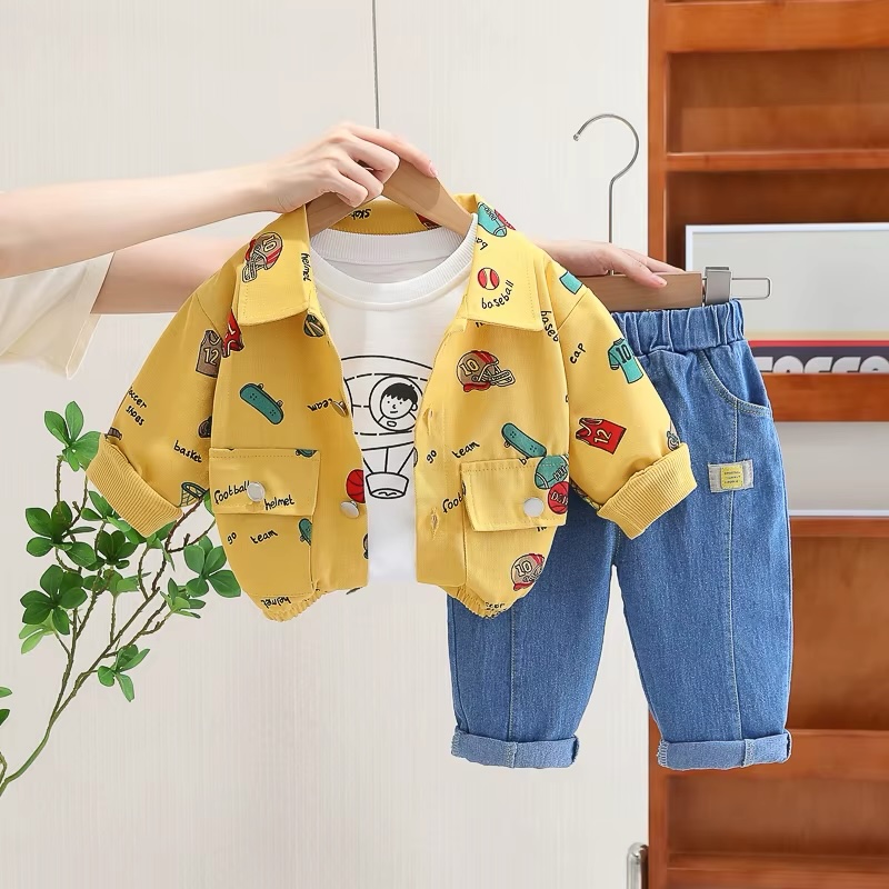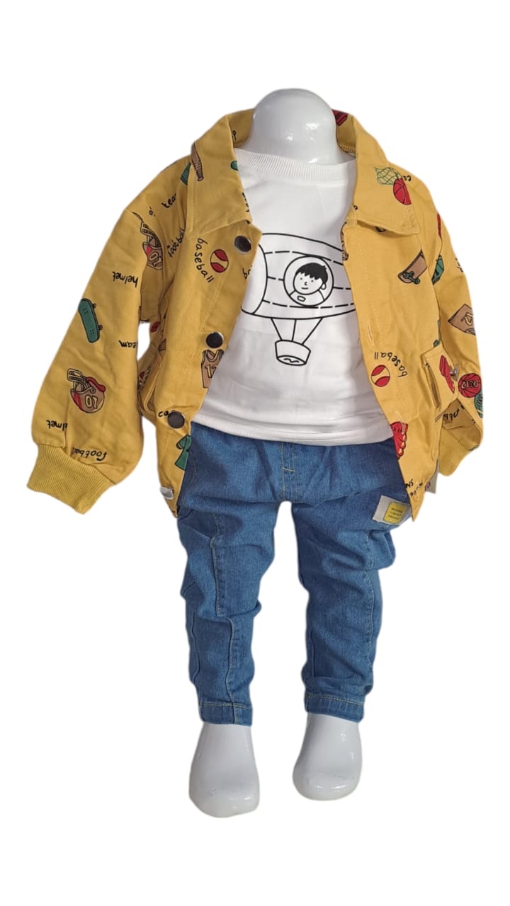 طقم ثلاث قطع للأطفال – جاكيت أصفر بنقوش خريفية 🍂✨